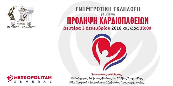 Ο Δήμος Παπάγου – Χολαργού και οι «Γιατροί της καρδιάς μας» του Metropolitan General, διοργανώνουν εκδήλωση ενημέρωσης για την πρόληψη καρδιοπαθειών, τη Δευτέρα 3 Δεκεμβρίου και ώρα 18:00, στην αίθουσα «Μ. Μερκούρη», του δημαρχείου Παπάγου – Χολαργού.