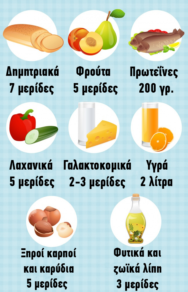 – Άπαχα γαλακτοκομικά προϊόντα: 2-3 μερίδες ημερησίως (μία μερίδα = 50 γραμμάρια τυριού ή 0,15 λίτρα γάλα).