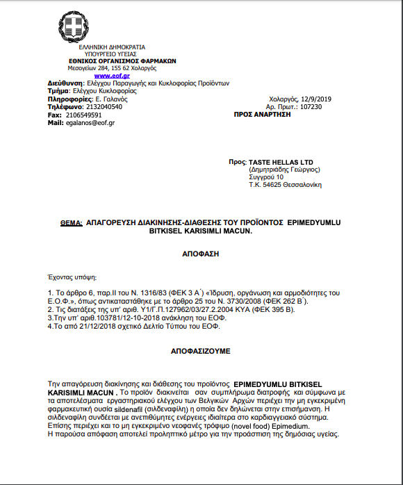 Την απαγόρευση διακίνησης και διάθεσης του προϊόντος EPIMEDYUMLU BITKISEL KARISIMLI MACUN ανακοίνωσε ο Εθνικός Οργανισμός Φαρμάκων, καθώς, όπως αναφέρει σε σχετική ανακοίνωση, το προϊόν το οποίο διακινείται ως συμπλήρωμα διατροφής σύμφωνα με τα αποτελέσματα εργαστηριακού ελέγχου των βελγικών αρχών περιέχει τη μη εγκεκριμένη φαρμακευτική ουσία sildenafil (σιλδεναφίλη) η οποία δεν δηλώνεται στην επισήμανση.